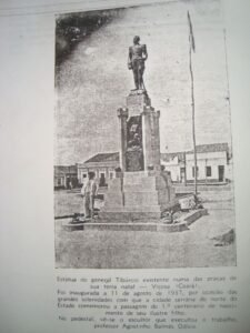 “MONUMENTO – TIBÚRCIO – O povo cearense erigiu hontem a si próprio monumento immorredoiro. A estátua erguida ao general Antônio Tibúrcio Ferreira de Souza, attestará aos posteros a grandeza civica e a energia moral de que exubéra a alma desta geração. Porque só um povo de heróes sabe glorificar assim os heróes. Três annos sómente, são passados sobre a morte do bravo soldado e os seus concidadãos, antecipando-se quasi ao juizo da História, empenharam-se e não addiar por um momento sequer a homenagem, que as gerações por vir hão de confirmar. Nessa soffreguidão da apotheose ia também o empenho, justamente vaidoso, dos coevos de se affirmarem perante a posteridade, glorificando no valor de um soldado as virtudes de uma raça. E a posteridade dará razão. Na língua viril do Lúcio, a mais eloquente expressão do pensamento heroico, Virtus chama-se ao valor. Os conterrâneos de Tibúrcio receberam dos patrícios dos Scipiões e do César, a mesma concepção da bravura. A sua glória é a sua virtude e a sua virtude é o seu valor. O cearense, batalhador eterno, a quem a natureza creou no próprio solo ingrato o crysol do heroismo, devia penetrar na immortalidade sob a figura do filho do povo, que abriu caminho através da obscuridade sob a figura do filho do povo, que abriu caminho através a obscuridade e do infortunio, que ascendeu da choça, para a Historia, que desceu, pés descalços, a escarpa da montanha natal para subir, corôado de estrellas, o degrao de bronze da immortalidade. A fé de officio do governo devia de ser effectivamente o passaporte desta geração para o Pantheon. E é por isto que, hontem, quando as turbas aclamaram desvanecimento, si o povo pelo heróe, si o heróe pelo povo. Conta-se que Miguel Angelo, ao acabar a magestosa estatua de Moyses, ficou tão assombrado daquella admiravel creação do seu genio, que não sabia se explicar o que é que lhe faltava a ella para viver, e batendo-a com o martelo, exclamou desvairado: Por que não falas? o que o cinzel do genio que lhe não perde revelar ao espirito de turbas revelou-o hontem o sentimento das sua propria gloria. Quem de feito, não viu pairar nos labios de bronze da estatua, a exclamação de orgulho do cearense illustre, desvanecido da nobreza do seu povo? De certo, si a alguém fôra dado encostar-lhe o ouvido ao duro feito metallico, teria sentido palpitar lá dentro o coração de Tiburcio, tumido de emoção diante d’aquelle espetaculo grandioso de virilidade, de nobreza e do civismo”.