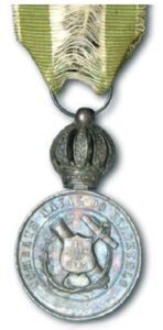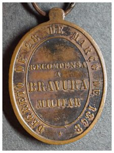 Medalha do Mérito Militar – A bravura militar, concedida pelo Decreto nº 4.131 de 28 de março de 1868, para os que se distinguirem por bravura em qualquer ação de guerra; de bronze, e pendente do peito esquerdo por uma fita de dois dedos de largura e três litas iguais, escarlate a do centro e verde as extremas. Afita terá tantos passadores de prata (7,7, a,b,c,d, etc), quantas forem as vezes em que tiver sido galardoado com a mesma medalha. Em cada passador haverá inscrito a época do feito meritório. O Decreto nº 4.143 de 5 de abril, fez extensivo à armada a medalha de mérito para as praças do exército. (Foto: Acervo fotográfico do Comando da 10ª região Militar/ General-de-Divisão Lima Verde).