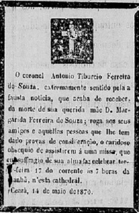 “GENERAL TIBÚRCIO – Um golpe terrível vem de enlutar a nossa capital, roubando a existência do illustre general Antônio Tibúrcio Ferreira de Souza. Tendo adoecido no anno passado veio da Côrte para essa província a procura de melhora, retirando-se no fim do anno para Pernambuco afim de exercer o cargo de commandante das armas dessa província. Havendo se aggravado os seus incomodos de saude pediu despensa deste cargo e voltou para esta capital, onde falleceusabado ultimo, às 9 horas noite, sepultando-se no domingoa tarde. O seu enterro foi um dos mais concorridos que tem havido nesta Capital. Um immenso concurso do povo acompanhando o feretro até o cemiterio, como signal de profunda magoa que causara a perda do illustre cearense que era uma affirmação gloriosa do patriotismo nacional. Os distintos officiaes do 11º batalhão e outros militares, amigos do general Tibúrcio carregaram o caixão até o cemitério. Ahi oraram com profundo sentimento e emoção os Srs. Capitão Miranda Santos, acadêmico Abel Garcia e alferes alumno Barbosa Lima, que lembraram a sua vida militar, cheia de nobres ensinamentos pelos seus actos de bravura. O general Tiburcio, tinha47 anos de idade. Era condecorado com o dignatário da Rosa, Oficcialito do Cruzeiro, Habito de Christo, Medalha do Mérito Militar. Compartilhando a dor que afflige a illustre familia do general Tiburcio, dirigimo-lhes a nossas condolencias, especialmente a sua digna esposa e seu genro, Exma. Sra. Dona Maria Augusta de Souza e Capitão Antônio Gomes Carneiro.”