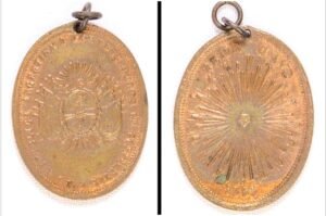 Medalha de Prata de Corrientes – Raríssima medalha de Guerra do Paraguai aos vencedores de Corrientes, concedida pelo Congresso Argentino aos combatentes de Corrientes. Modelo entregue aos brasileiros, com contra argola atravessando a medalha. Datada de 25 de maio de 1865. Em liga de cobre/bronze. (Foto: Acervo fotográfico do Comando da 10ª região Militar/ General-de-Divisão Lima Verde).