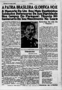 “Em sua cidade natal. no Ceará, inaugura-se o seu monumento – outras solemnidades de caracter civico. Comemora-se hoje o centenário de nascimento do general Tibúrcio de Souza, na antiga Villa de Viçosa no Ceará. Filho de soldado, neto de soldado, a sua árvore genealógica tem o seu trono em militares do tempo da colônia. Feito na carreira das armas, com o curso da antiga Escola da Praia Vermelha, della saiu 2º Tenente, em57. Passou ainda pela Escola Central onde se distinguiu em sciencias physicas e mathematicas. É depois professor de Physica e Chímica na Escola Militar. No Magisterio, tem lugar destacado. Como guerreiro, participou do Cerco de Montevidéo contra os blancos em 1864. Assiste à captulação da praça uruguaia. Continua sua ação nas forças contra Lopez, no Paraguay, em 1865. Dali, por diante, são numerosos os episódios de campanha em que a bravura deTibúrcio tem as maiores expressões. Caxias louva-o com enthusiasmo, refere-se a elle com palavras de alta significação. É ferido em Tuyuti. Refeito volta ao campo da luta. Vai subindo de posto, adoece, vem ao Rio, retorna ao Paraguay, fôrça com suas tropas, a passagem de Humaytá, e toma a fortaleza inimiga. Adoece de novo e mal se restaura, em 1869, vae para a batalha final da Cordilheira, para Peribebuy e Campo Grande. Terminada a guerra, o patriota não repousa. Dirige obras militares na fronteira, em região inhospita. Depois é diretor da Escola Militar de Porto Alegre. Escreve na imprensa, artigos de Sociologia. Por fim, em 1880, é promovido a general. Além disso, Tibúrcio de Souza, era um republicano ardoroso, que não escondia a sua idéa. Foi chefe da comissão de compras do Exército na Europa. Nessa situação com facilidade de receber uma fortuna dos fornecedores, que de acordo com as praxes, lhe ofereceram vantagens, recusou-as. Mais tarde, a sua viuva, que dele herdara apenas a tradição de honradez e o nome glorioso, teve de aceitar uma pequena pensão decretada por Floriano.”
