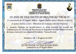 2019 – Diploma de reconhecimento ao apoio prestado por ocasião dos 182 anos do Brigadeiro Antônio Tibúrcio Ferreira de Souza, Comando da 10ª RM de Fortaleza, general de Divisão Fernando José Soares da Cunha Mattos.