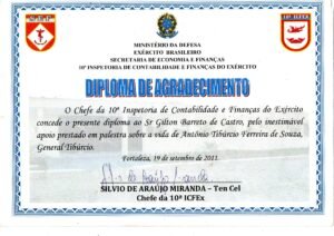 2011Diploma de agradecimento pelo inestimável apoio prestado sobre a vida de Antônio Tibúrcio Ferreira de Souza, pela 10ª Inspetoria de Contabilidade e Finanças do Exército (ICEFEX – Ten. Cel. Silvio de Araújo Miranda).